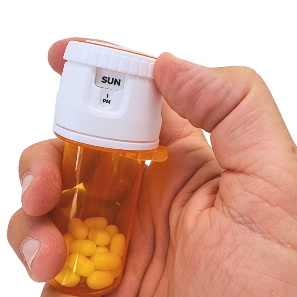 - Take your meds as usual by twisting off the 1-Clic® style prescription vial cap using the thumb tab then replace the cap assembly.