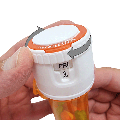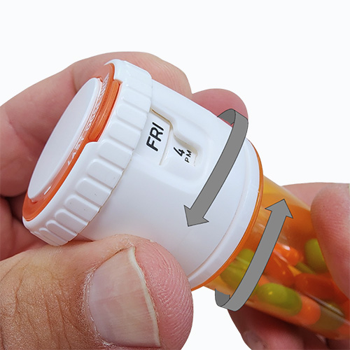 That's it! Your reusable Meticap is now ready to go! You can optionally choose to take the assembly over to your new prescription, or you could unscrew the Meticap from the old vial and screw it onto the new one. Note that squeezing the view window side is what keeps it from spinning. For multiple simultaneous prescriptions, we recommend that you use multiple Meticaps so that your meds always stay with their dosage and safety labels.